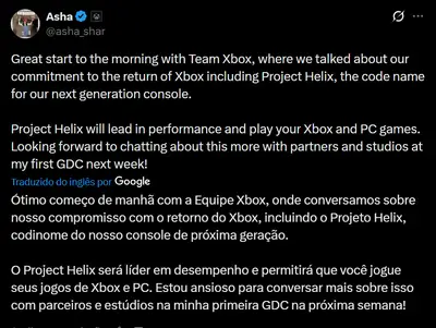 O Project Helix será líder em desempenho e permitirá que você jogue seus jogos de Xbox e PC, escreveu Sharma. Estou ansiosa para conversar mais sobre isso com parceiros e estúdios na minha primeira GDC na próxima semana.